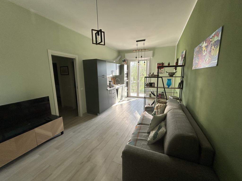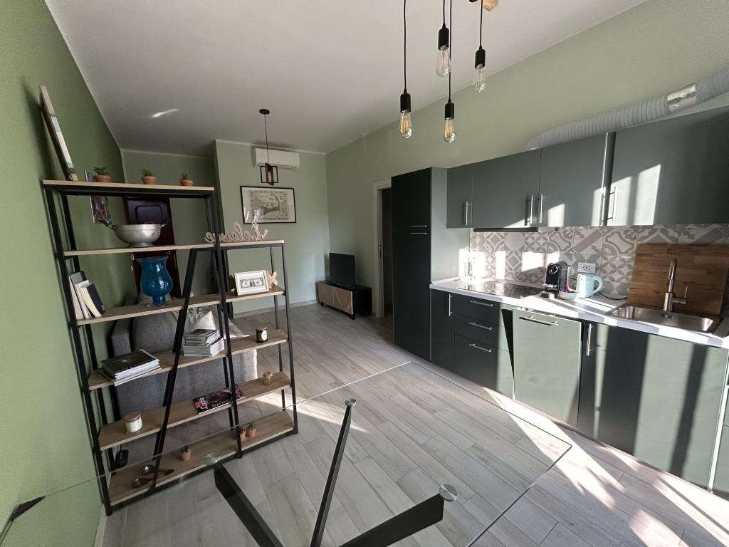 Ingresso sul living che è composto da zona TV/conversazione con un divano letto e zona pranzo con cucina a vista.