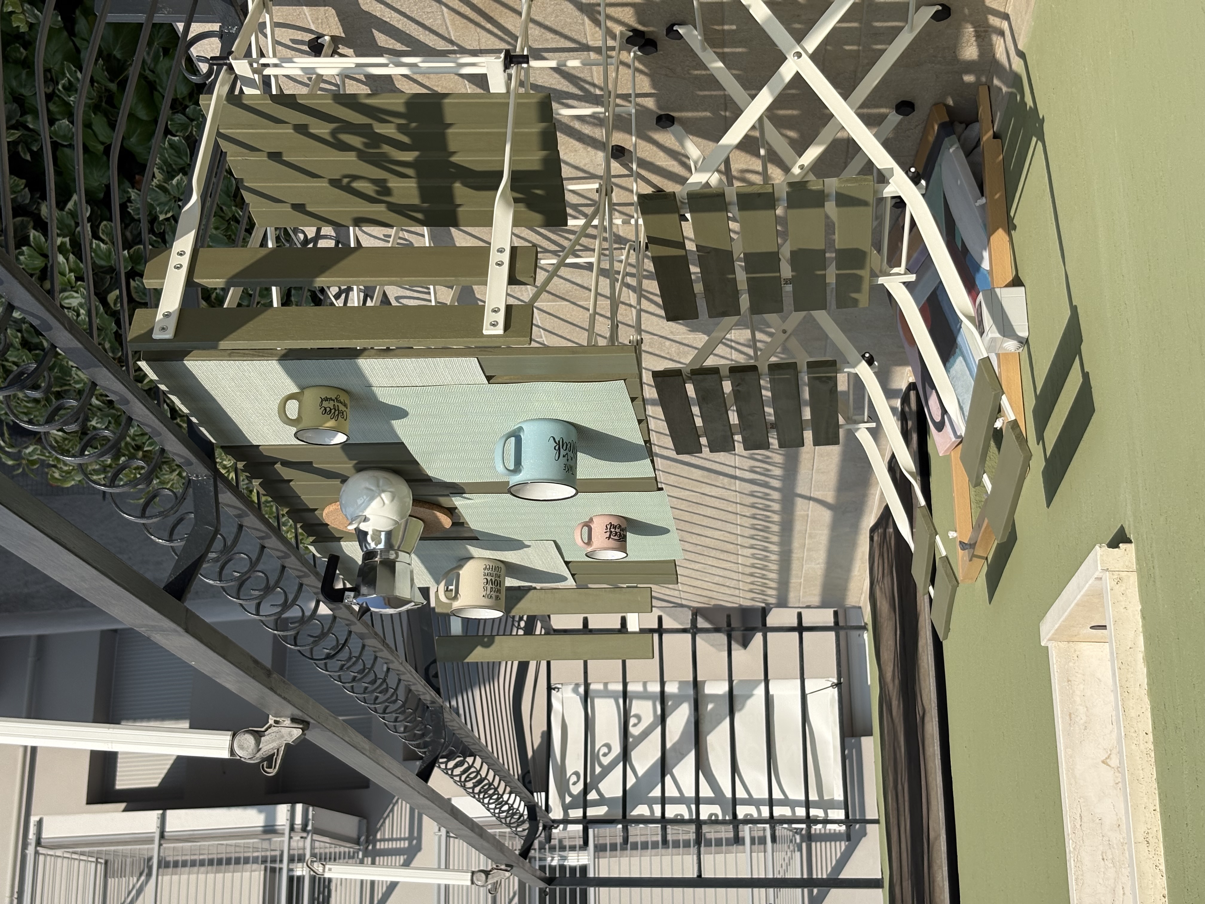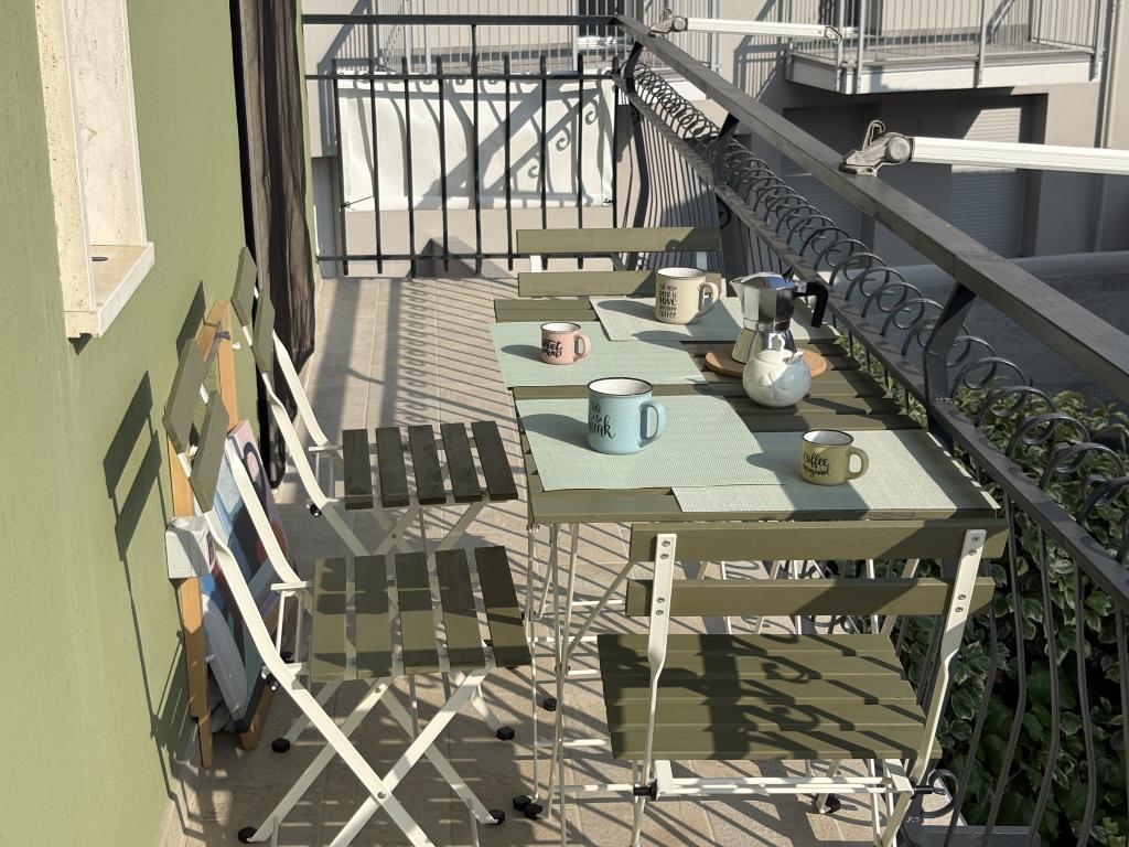 Balcone,a cui si può accedere dal living e dalla stanza matrimoniale, fornito di tende proteggi sole, tavolino e sedie